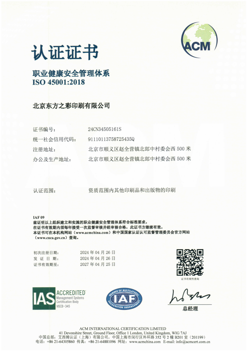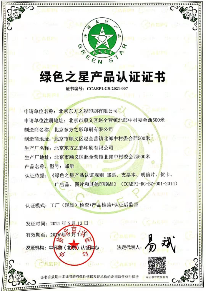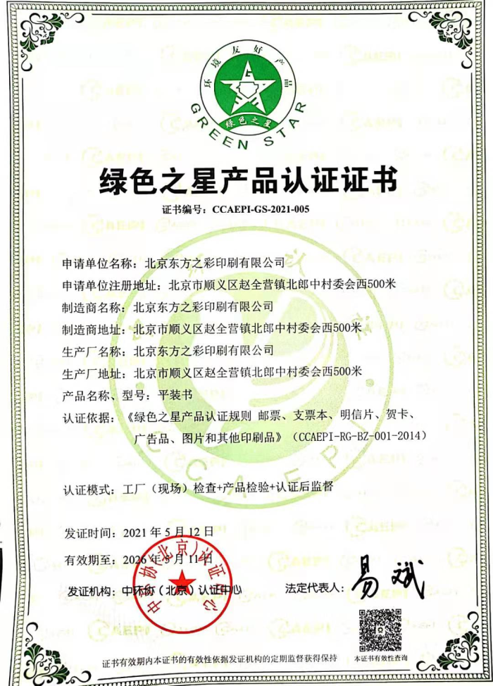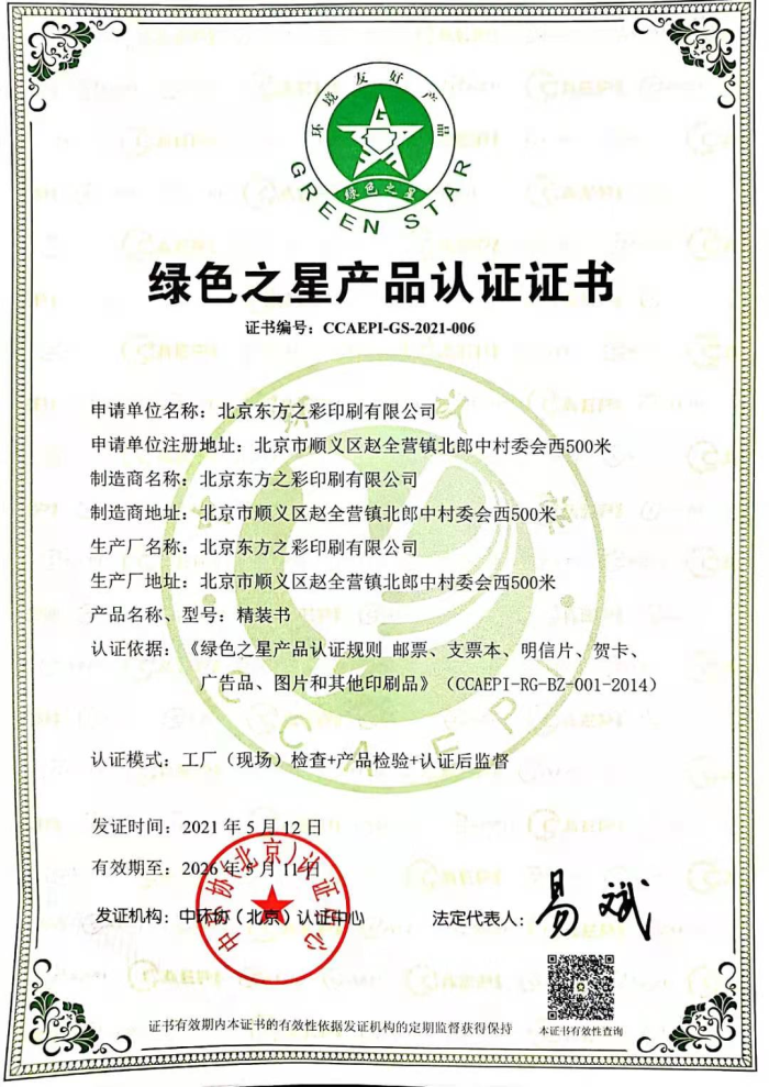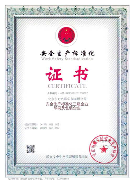 东方之彩先后荣获“中国绿色环境标志认证5类全通过”、“绿色之星认证3类全通过”、“GB/T28001、ISO45001职业健康安全管理体系认证”、“安全生产标准化认证”、“ISO9001质量管理体系认证”、“ISO14001环境管理体系认证”以及及严苛的“欧盟BSCI企业社会负责认证”、“国际FSC绿色森林认证”、“SA8000国际社会责任认证”、“世界百强验厂认证(如:迪士尼、中粮集团)”等;不断提升自身价值,让客户满意是我们永远的追求。