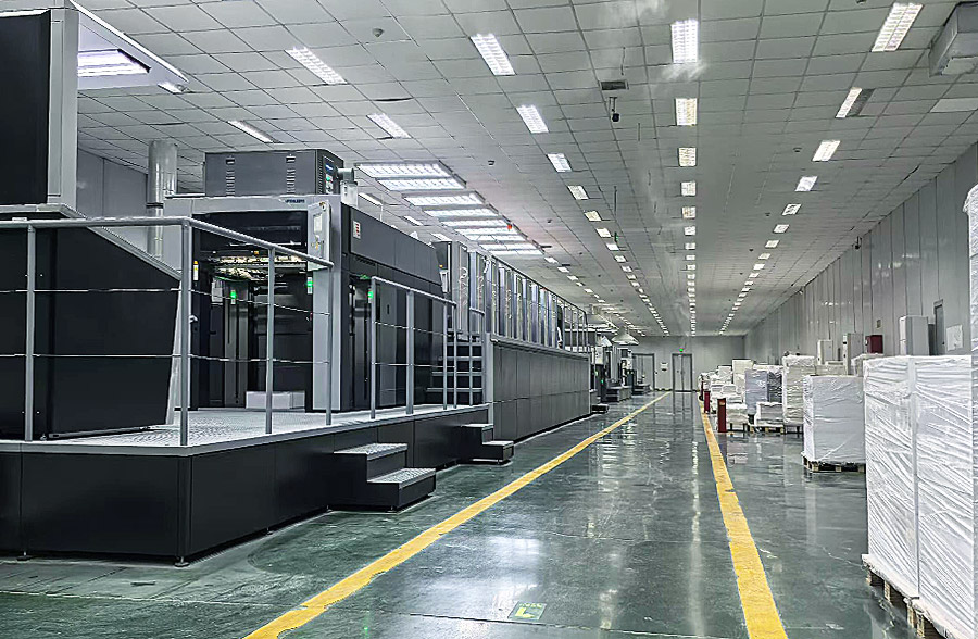印后全面实现自动化、联动化、智能化,全厂上百台代表世界先进水平的包装设备,用工业互联网和自动化货物传输系统大联动,形成智能化包装生产体系,代表了行业未来发展方向。拥有1040S可变数据喷墨系统、激光打码机、联线及成品检品机、激光光刻机、全自动920、1050对开烫金机、全自动920、1050对开模切机、全自动高速覆膜机、全自动高速UV丝印机、浩友夫光控高速皮壳机、全自动精装盒粘盒上盒流水线、全自动天地盒流水线、各种卡纸盒自动粘盒机、十余台包装机械手流水线、光刻机、光刻纸生产覆合分切流水线、波拉300切纸系统、MBO折页机、意大利阿斯达2000全自动锁线机、玛天尼普利玛骑订龙、柯尔布斯整条胶装龙、精装龙等一大批先进设备,我公司有全自动集藏品包装合片、贴片机,由十余台装订机械手组成的流水线等一大批发明专利设备,全面实现了产品生产的标准化、自动化、联动化、智能化。