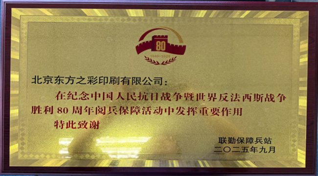 北京东方之彩印刷有限公司圆满完成《2509活动》重要保障任务 ,荣获中国人民抗日战争暨世界反法西斯战争胜利 80 周年阅兵保障活动受阅部队颁发的奖状。